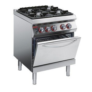18-10 Paslanmaz çelik yüzey,12/10 kalınlık. Üst tablalar ve çıkarılabilir brülörler Ø 110 KW 6 (çift taçlı brülör kafası) VE Ø 80 KW 4 (tek taçlı brülör kafası) pik döküm. Valf kontrollü, pilot alevli ve termokupllu. Yuvarlatılmış ve preslenmiş brülör çevresi. Termostatlı 3 x GN 1/1 paslanmaz gazlı konveksiyon fırın.