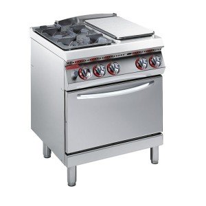 18-10 paslanmaz çelik yüzey,12/10 kalınlık. Üst tablalar ve çıkarılabilir brülörler Ø 110 KW 6 her biri pik döküm çift taçlı brülör kafası. Valf kontrollü, pilot alevli ve termokupllu. Yuvarlatılmış ve preslenmiş brülör çevresi, sağ tarafta pleyt. Paslanmaz çelik gazlı statik fırın 2/1 GN termostatlı.