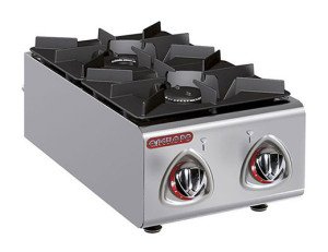 8-10 paslanmaz çelik üst yüzey, 10/10 kalınlıkta paslanmaz çelik serbest oturmalı. Üst tablalar ve çıkarılabilir brülörler pik dökümdür. (1 tek taçlı brülör Ø 80 mm kW 4; 1 çift taçlı brülör Ø 110mm kW 6). Valf kontrollü, pilot alevli ve termokupllu. Yuvarlatılmış ve preslenmiş brülör çevresi.