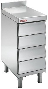 Satinajlı 18-10 paslanmaz çelik yapıda. 1/1 GN 100 mm h küvetler için paslanmaz çelik teleskopik raylar. 18/10 paslanmaz yüksekliği ayarlanabilir ayaklar. Sırtlı ön taraf yuvarlatılmış üst tabla 60 mm h, 12/10 kalınlığında. 295 mm h şişe veya 1/1 GN 200h konteyner için çekmece.