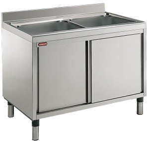 18-10 paslanmaz çelikten yapılmış pres baskılı satinajlı tabla. Sırtlı. Su geçirmez kesintisiz kaynaklı preslenmiş evye 18-10 çelikten yapılmış ön panel. 18-10 Paslanmaz çelikten yapılmış dolap çift cidarlı kayar kapılar. Taban raflı. Yüksekliği ayarlanabilir ayaklar. Küvet : 40*40*25h + 40*40*25h